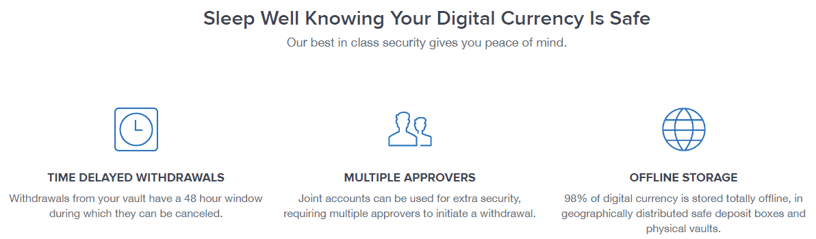 Clients have the option of storing some or all of their digital assets in a separate ‘vault’ wallet that has additional optional security features and a fixed 48 hour waiting period for all withdrawals.